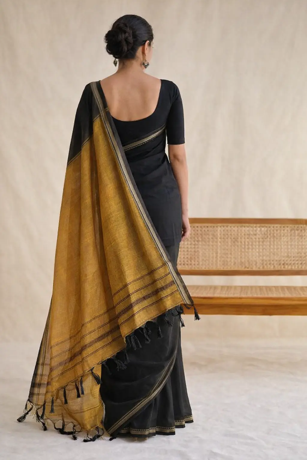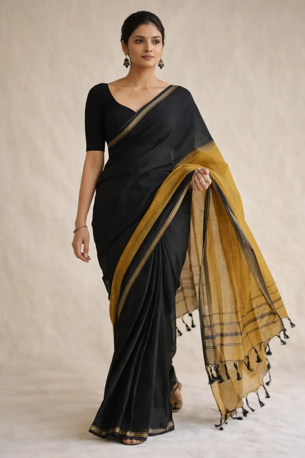Black Handloom Mul Cotton Plain Sarees with Temple Border and Mustard Pallu with tassels : 5.50 Meters